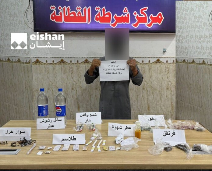 وذكرت القيادة في بيان تلقته “إيشان”، أن “المتهم (س.م.ظ.ح) جرى استدراجه وضُبطت بحوزته مواد تُستخدم في أعمال السحر والشعوذة”، مؤكدة أنه تم توقيفه وفق المادة (456 ق.ع) ليأخذ جزاءه العادل أمام القضاء.