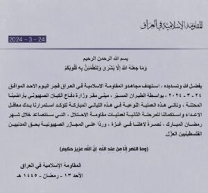 وذكرت المقاومة، في بيان، حصلت عليه منصة “إيشان”: “بفضل الله وتسديده استهدف مجاهدو المقاومة الإسلامية في العراق فجر اليوم الاحد الموافق 24 – 3 – 2024، بواسطة الطيران المسيّر مبنى مقر وزارة دفاع الكيان الصهيوني بأراضينا المحتلة”.