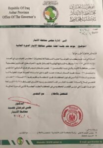 وذكرت وثيقة صادرة من مكتب المحافظ، اليوم الأحد، وردت لمنصة “إيشان”، أن “الدليمي وجه إدارة مجلس محافظة الأنبار، بتبليغ أعضاء المجلس (الفائزين الجدد)، بموعد الجلسة الاولى لمجلس المحافظة بدورته الحالية، والمقرر انعقادها في تمام الساعة الواحدة من ظهر يوم غدٍ الاثنين الموافق الخامس من شهر شباط عام 2024، وذلك في القصر الحكومي بمدينة بالرمادي”.