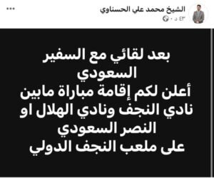 وبحسب الحسناوي الذي أشار إلى أنه التقى بالسفير السعودي عبد العزيز الشمري، وأعلن إقامة مباراة بين نادي النجف والهلال أو النصر على ملعب النجف الدولي.