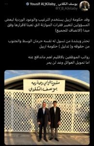 وقال الكلابي في تدوينة عبر موقع “إكس” تابعتها “إيشان”، إن “وفد حكومة اربيل يستخدم الترغيب والوعود الوردية لبعض المسؤولين لتغيير فقرات الموازنة التي تعبنا لاقرارها وفق مبدأ (الانصاف للجميع)”.