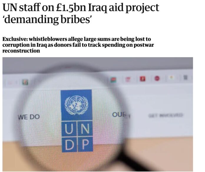 لكن المقابلات مع أكثر من عشرين من موظفي الأمم المتحدة الحاليين والسابقين والمقاولين والمسؤولين العراقيين والغربيين تشير إلى أن الأمم المتحدة تغذي ثقافة الرشوة التي تغللت المجتمع العراقي منذ الإطاحة بصدام حسين في عام 2003، وفق الغارديان.