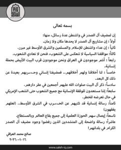 ولفت إلى أنها “رسالة واضحة إلى المتشددين الذين رفضوا وجود مضيف آل الصدر الكرام في بلدانهم!”.
