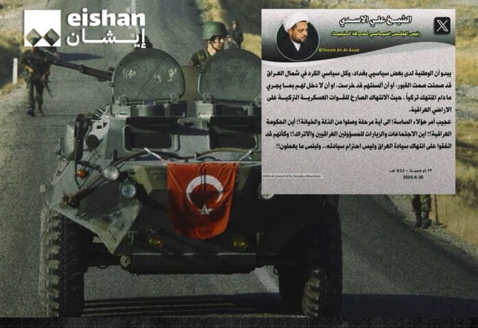وقال الأسدي، في تديونة تابعتها منصة “إيشان”: “يبدو أن الوطنية لدى بعض سياسيي بغداد، وكل سياسي الكرد في شمال العراق قد صمتت صمت القبور، أو أن ألسنتهم قد خرست، او أن لا دخل لهم بما يجري ما دام المنتهك تركياً، حيث الانتهاك الصارخ للقوات العسكرية التركية على الاراضي العراقية”.