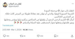 ونشر غيلان نجل السياب تدوينة على تويتر: “انتقلت إلى جوار الله ورحمته السيدة الكريمة الصبورة الوفية، والدتي أم غيلان بعد معاناة طويلة من المرض كانت خلاله من الصابرين الشاكرين”.